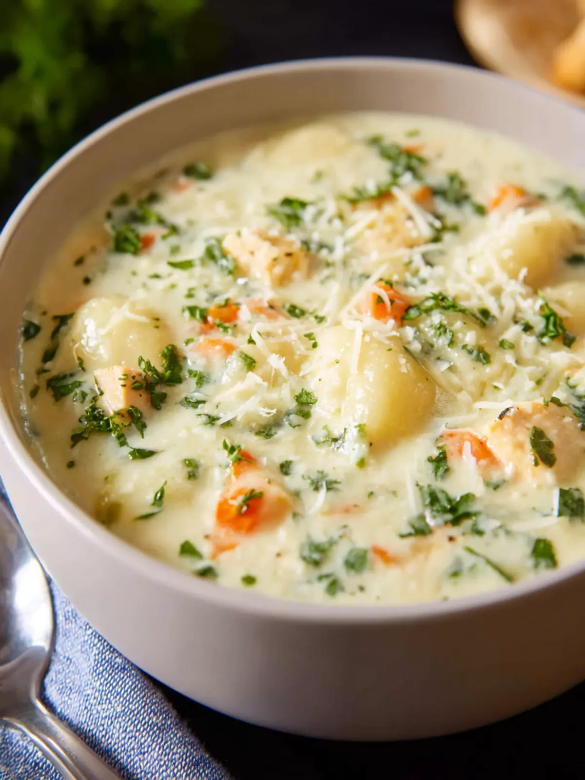A hearty and creamy soup featuring chicken, gnocchi, and vegetables, perfect for any occasion.