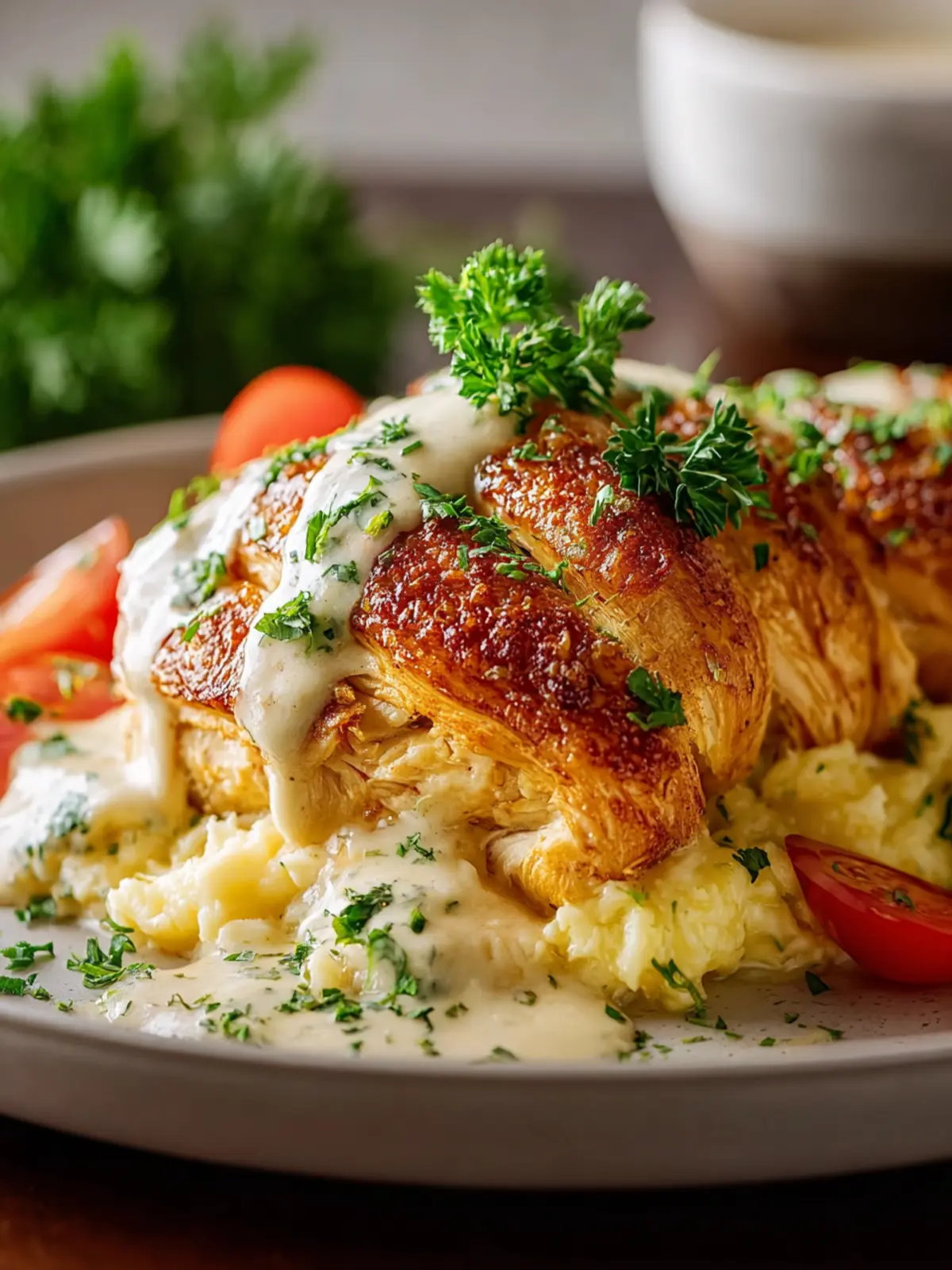Delicious chicken pillows filled with cream cheese and herbs, served with a creamy Parmesan sauce.