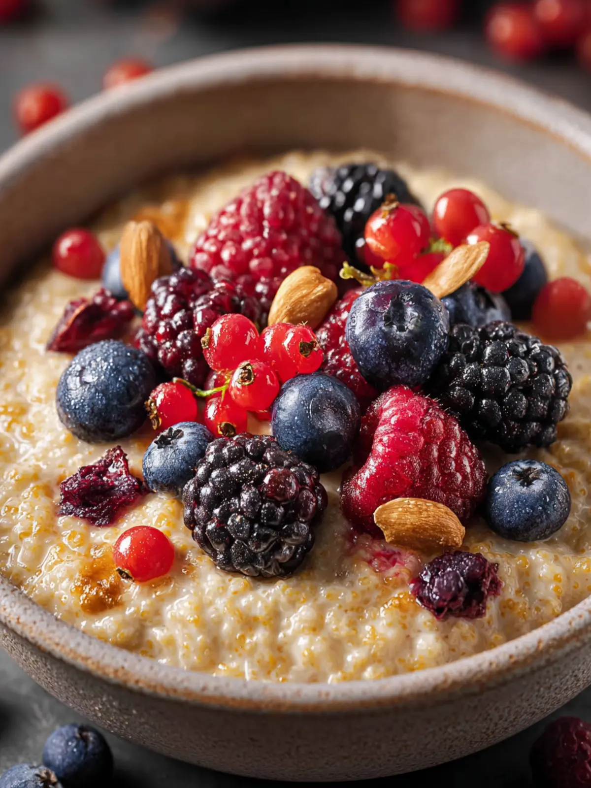 A delicious and creamy millet dish topped with fresh berries, perfect for breakfast or a healthy snack.
