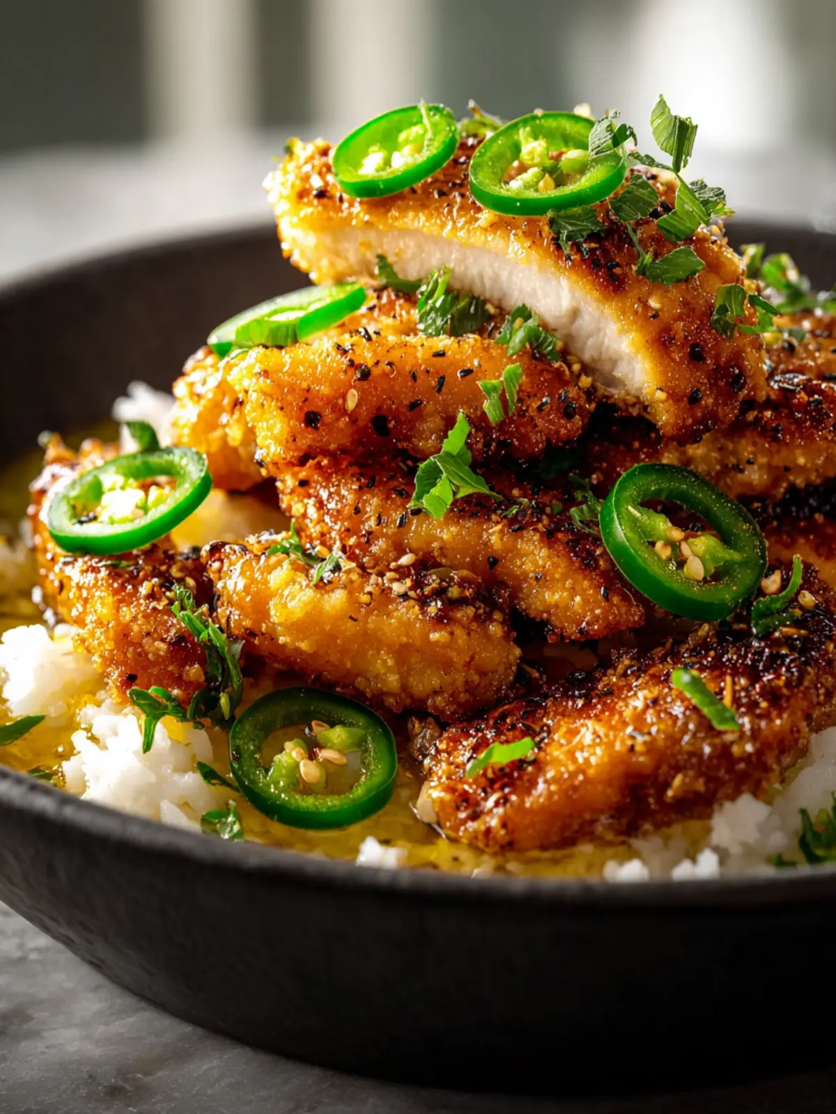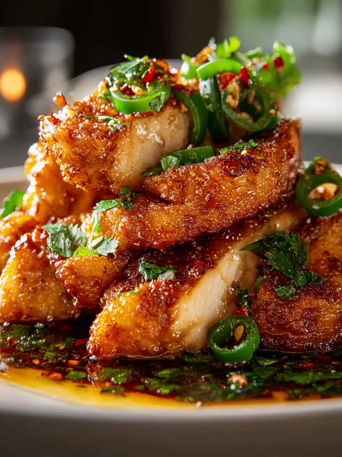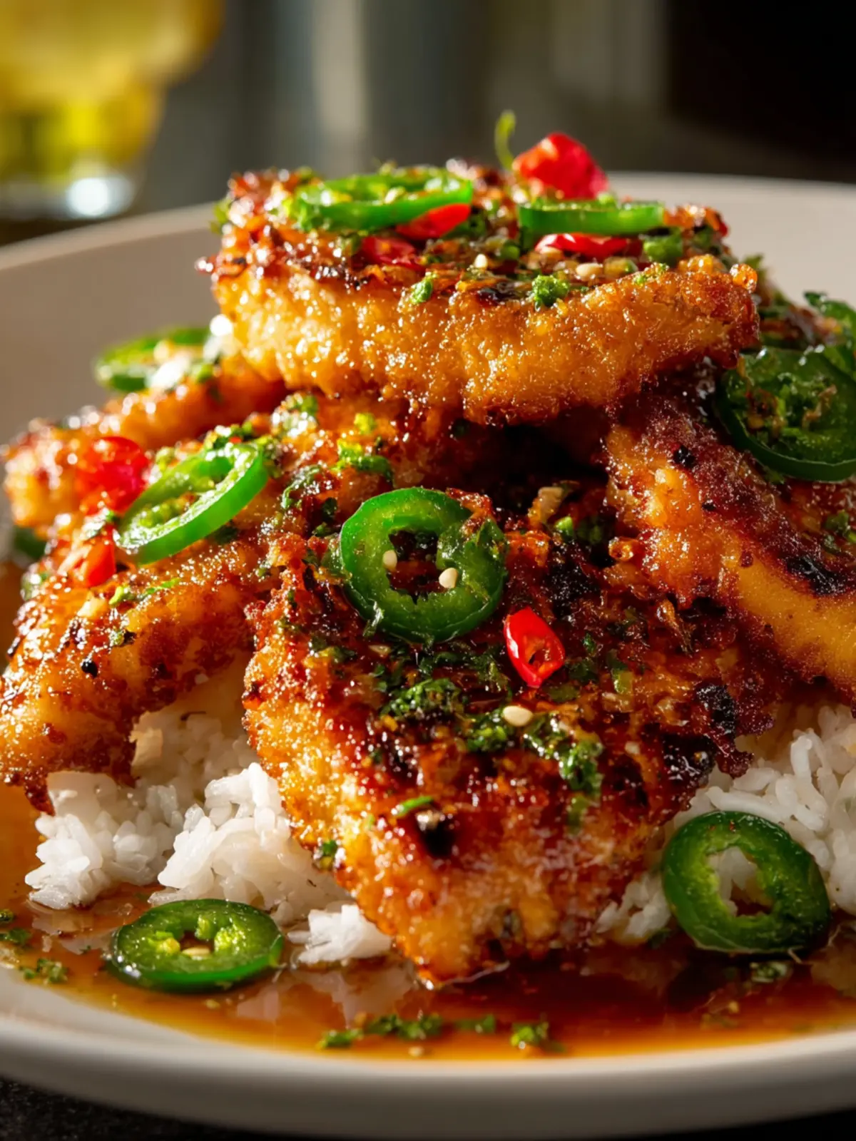 Deliciously crispy chicken thighs coated in a spicy garlic glaze, perfect for pairing with steamed rice and vegetables.