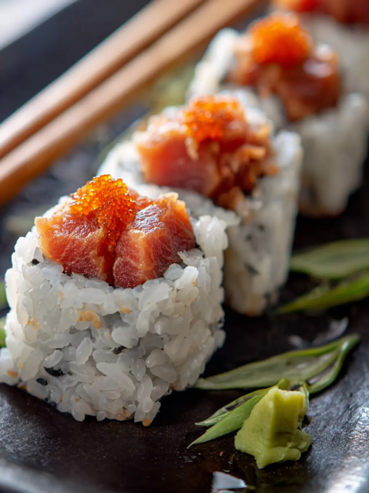 Delicious sushi rolls filled with minced tuna, capelin roe, and spicy mayo, wrapped in nori and sushi rice.