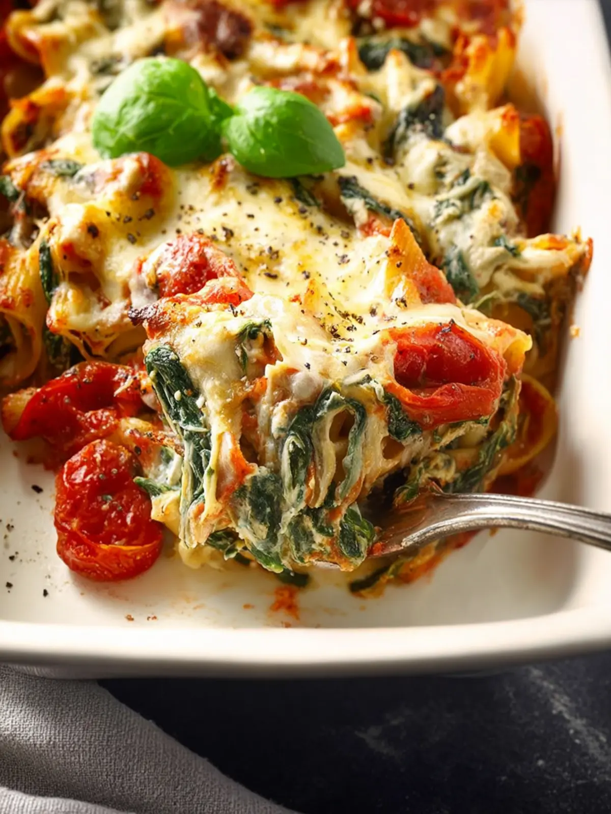 A delicious cheesy pasta bake with fresh spinach and tomatoes, perfect for a comforting meal.